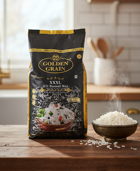 It is an ideal choice for preparing biryani, pulao, fried rice, and other special rice dishes, making it highly preferred by households, hotels, restaurants, caterers, and bulk buyers. Golden Grain XXXL Basmati Rice is carefully processed under hygienic conditions and packed properly to maintain freshness, purity, and consistent quality.